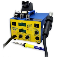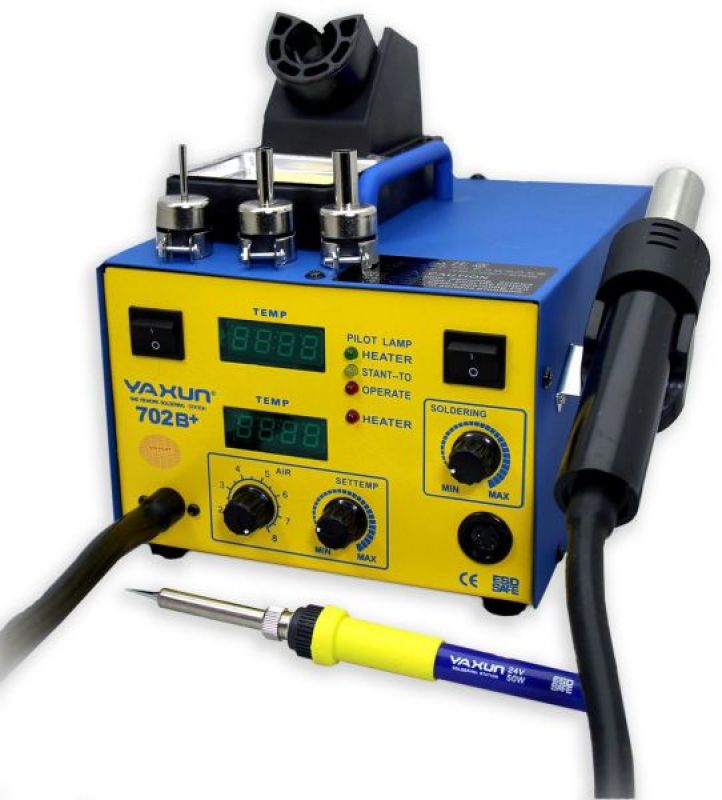 Soprador de Ar Quente Temperatura do Ar Quente: 150ºC - 500ºC. Potência de Consumo: 350W Fluxo de Ar: 0,3 - 24L/min. ajustável Potência da Bomba:45W Acessórios: Jogo com 3 Bocas/Pontas p/ manopla de Ar Quente Ferro de Solda Temperatura do Soldador: 200ºC - 480ºC Potência de Consumo:50W Tensão de Alimentação: 24v ESD Safe (Proteção Antiestática) Dimensões: 24x18,5x13cm.