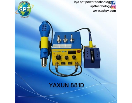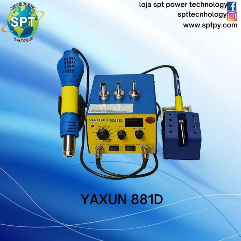 - Estação de solda e retrabalho - Yaxun 881D; - Estação completa e compacta; - Uso industrial profissional; - Ferro de solda; - Soprador de ar quente; - Painel de controle individualizado; - 1 Display digital para amostragem da temperatura do soprador; - 2 Knob?s menores para ajuste do soprador de ar (Vazão e Temperatura); - 1 Knob para ajuste da temperatura do ferro de solda; - 2 Chaves ON/OFF independentes; - Suporte para ferro de solda com esponja vegetal; - Suporte para soprador de ar; - 3 Bocais diferentes para soprador de ar; -- Estrutura com revestimento antiestático;